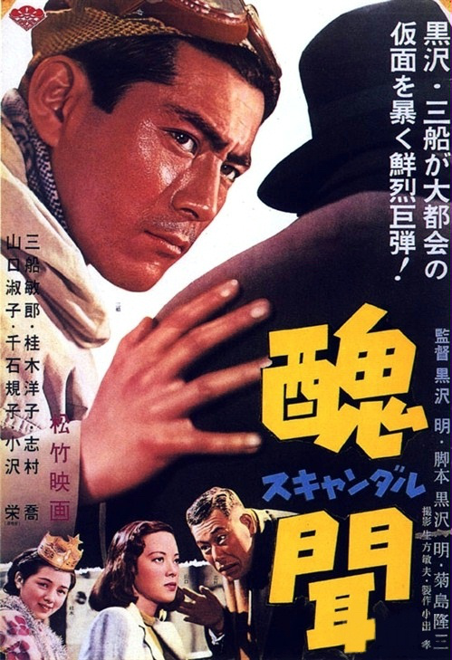 Komentarz: Skandal jest jedyną produkcją Kurosawy, zrealizowaną dla studia Shochiku, znanego szczególnie z pozycji tworzonych przez takich klasyków japońskiej kinematografii, jak Yasujirō Ozu, Kenji Mizoguchi czy Mikio Naruse. Choć film zdecydowanie ustępuje trzem poprzednim obrazom reżysera i następującemu po nim, mającemu premierę jeszcze w tym samym roku Rashomonowi, to wciąż jest wart uwagi. Kontynuuje on kreślenie obrazu ówczesnej, powojennej rzeczywistości Japonii, acz decyduje się zbliżyć do sfer wyższych oraz do tematu rosnącej wagi kolorowych magazynów, kształtujących umysły czytających ich mas.